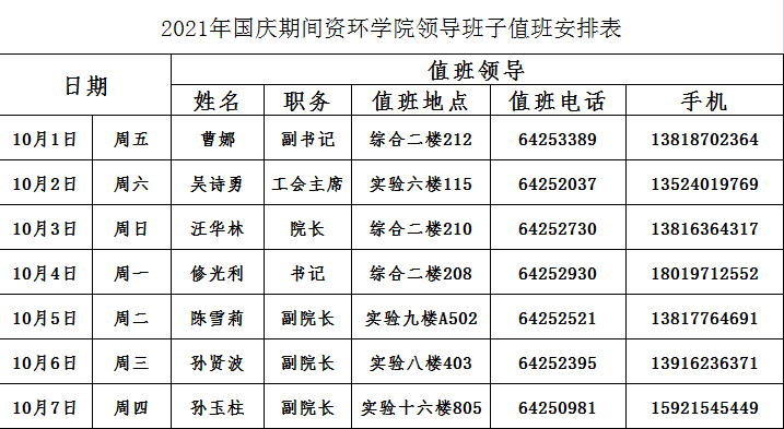 2021年国庆期间36365线路检测中心领导班子值班安排表