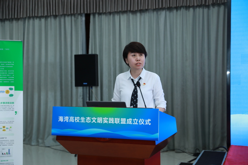 崔姗姗为联盟成立致辞。她表示,成立海湾高校生态文明实践联盟,与奉贤区委、区政府推动“三区两镇”战略实施,与奉贤区海湾镇打造上海首个全要素城镇型“低碳发展实践区”相辅相成,这不仅是高校间互通有无、取长补短、强强联合的生动实践,也为助推区域经济社会高质量发展搭建了平台,更是深入学习贯彻习近平生态文明思想的重要举措,希望海湾高校生态文明实践联盟顺利起航,共创生态文明建设崭新篇章。