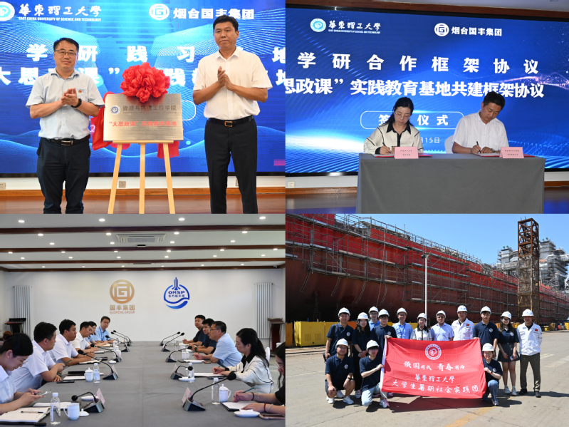 在国丰集团,调研团一行在王德涛副总经理的带领下,参观了调研了东方航天港固体火箭总装基地(东区)、商业液体火箭总装基地、海上发射技术服务港综合保障厂房、新型海上发射船、科普教育基地(指控中心)和卫星数据产业园等并召开座谈会,围绕航空航天、生物医药、化学化工等产业领域的人才引进、教学实践、业务合作等进行深入探讨和交流。国丰集团党委委员、副总经理齐贵山和学院党委副书记曹娜共同签署产学研合作协议、“大思政课”实践教育基地共建协议,国丰集团副董事长、东方航天港集团董事长高中前和学院党委书记修光利共同为华东理工大学碳中和产业学院产学研践习基地、36365线路检测中心“大思政课”实践教育基地揭牌。